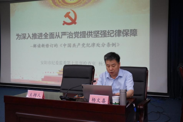 會上,市紀(jì)委監(jiān)委第七監(jiān)督檢查室主任楊文喜以“為深入推進(jìn)全面從嚴(yán)治黨提供堅強(qiáng)紀(jì)律保障”為題,為集團(tuán)全體黨員干部解讀新修訂的《中國共產(chǎn)黨紀(jì)律處分條例》。主要從《條例》的重要意義、特點、主要內(nèi)容以及如何抓好《條例》的學(xué)習(xí)貫徹執(zhí)行等四個方面進(jìn)行了詳細(xì)講解。