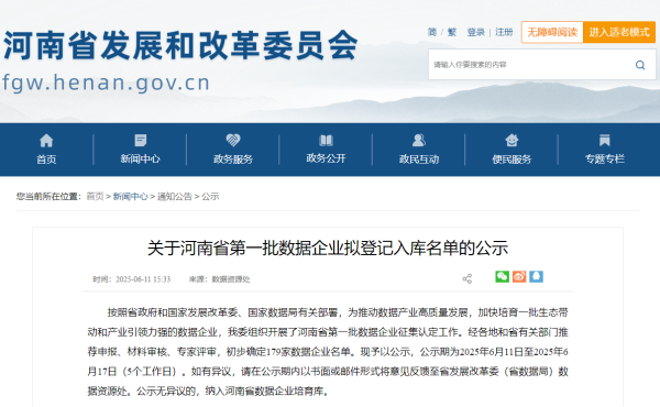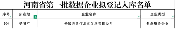 6月11日,河南省發(fā)展和改革委員會(huì)公示河南省第一批數(shù)據(jù)企業(yè)擬登記入庫名單。經(jīng)各地和省有關(guān)部門推薦申報(bào)、材料審核、專家評(píng)審,初步確定安陽經(jīng)開信息化發(fā)展有限公司等數(shù)據(jù)企業(yè)名單。