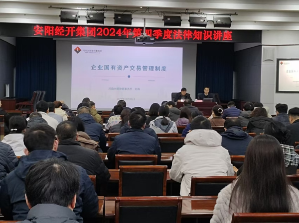 12月25日上午,河南興鄴律師事務所劉濤律師應集團邀請在市財政局綜合會議室,以“企業(yè)國有資產(chǎn)交易與管理制度”為主題,為集團全體員工進行法律知識宣講。集團黨委委員、監(jiān)事長謝俊生主持本次講座,集團領導班子成員及全體員工參加了講座。