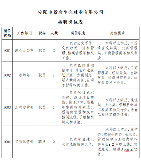 安陽市景欣生態(tài)林業(yè)有限公司(以下簡稱“景欣林業(yè)”)是安陽市國家儲備林建設(shè)PPP項(xiàng)目公司,根據(jù)工作發(fā)展需要,擬委托安陽鼎泰勞務(wù)派遣有限責(zé)任公司(以下簡稱“鼎泰公司”)面向社會公開招聘6名工作人員?,F(xiàn)將有關(guān)事項(xiàng)公告如下: