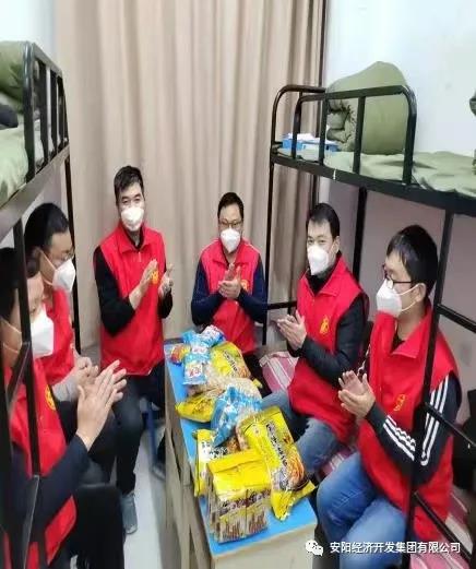 1月25日,是經(jīng)開集團(tuán)志愿者秦勝攀34歲的生日。在晝錦中學(xué)隔離點(diǎn),他向往常一樣重復(fù)著為隔離人員配送生活物資、清理垃圾、環(huán)境消殺等工作。下班后在宿舍出現(xiàn)了暖心的一幕:在這個(gè)特殊的時(shí)期、特殊的地方、特殊的環(huán)境,沒有蠟燭、沒有蛋糕,但有特殊的“家人”陪他一起過生日?!凹胰恕眰兗娂姳硎緪坌?,送上了溫暖的祝福。